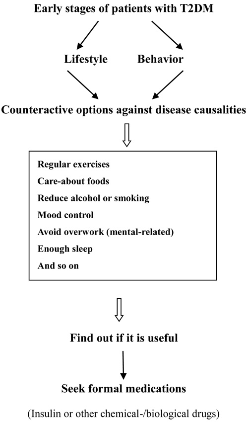 Developing T2DM might undergo a lengthy and complex course, even pathogenesis cascade processes, in susceptible human beings. Some of them are even partly family inheritable diseases, like obesity and hypertension. Yet the T2DM pathogenesis processes and cascade are often difficultly reversed. Onset stage can more easily slow down disease progression and reduce patient’s morbidity rates in general people. A reliable, long-lasting and multi-functional medical education of diabetes may arise the attention of wider populations, especially to old persons who are more susceptible to T2DM events. Given asymptomatic in early stages of T2DM, regular blood glucose level checkup in persons (>40 years old or in sedentary occupation) is introduced.