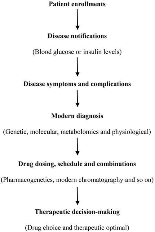 It is possible that the clinical symptoms, stages and event of blood glucose escalation may vary among different people in the clinic, especially in the aspect of human genome. As a result, T2DM treatments for each patient should not be uniform. PDT based on genomic alterations may be a futuristic medical hot-spot that will enable doctors to provide optimal therapeutics for individual patients with T2DM [19-23]. Nonetheless, PDT should not be restricted to pharmacogenetics (PG) technology alone as it is now solely reliant in the clinic globally [19-25]. At this stage of technical capability, PG study mainly focuses on drug concentration in human blood by detecting Single Nucleotide Polymorphisms (SNPs) of human metabolic enzymes (approximately 300 metabolic molecules in normal human body), modern chromatography and capillary electrophoresis. Despite a lot of PG study and report for diabetic therapy, it is not applied as diagnostic routines in general hospitals worldwide. Like PG for cancer treatment [23], approaches outside of the scope of the current diagnostic/therapeutic system might be invented in the future.
