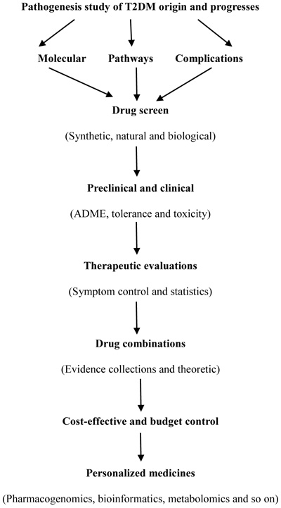 Generally speaking, chemo-therapeutic drugs for T2DM are not without toxicity. Though many chemotherapeutic drugs for T2DM are not very toxic comparing with other drug categories, their therapeutic responses need a relatively long term to exhibit and incurable. Prescribing optimal drug doses or schedules in specific diabetes conditions in individual patients has to be renewed and wider application. Long-term adjustments for drug dosing and schedule require interaction and cooperation between doctors and patients (Table 2 and Fig. 1). As a result, large-scale pharmacologic or clinical study is indispensable and long awaited.